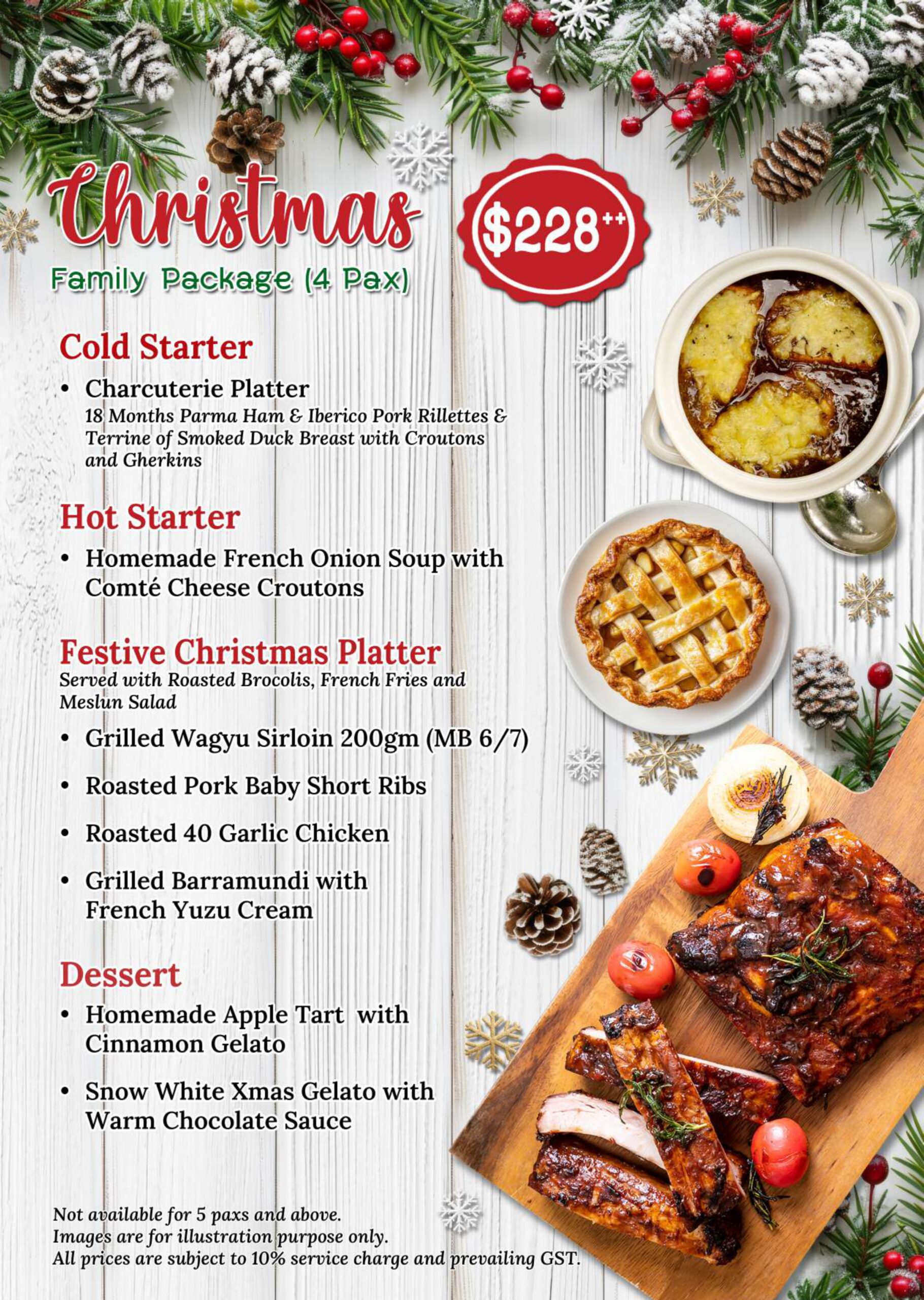 Celebrate the holidays with a decadent 4-course Family Package for 4 pax at $228++. The feast includes a luxurious Charcuterie Platter, French Onion Soup, a huge Festive Platter of Wagyu Sirloin, Roasted Chicken & more, and two desserts.