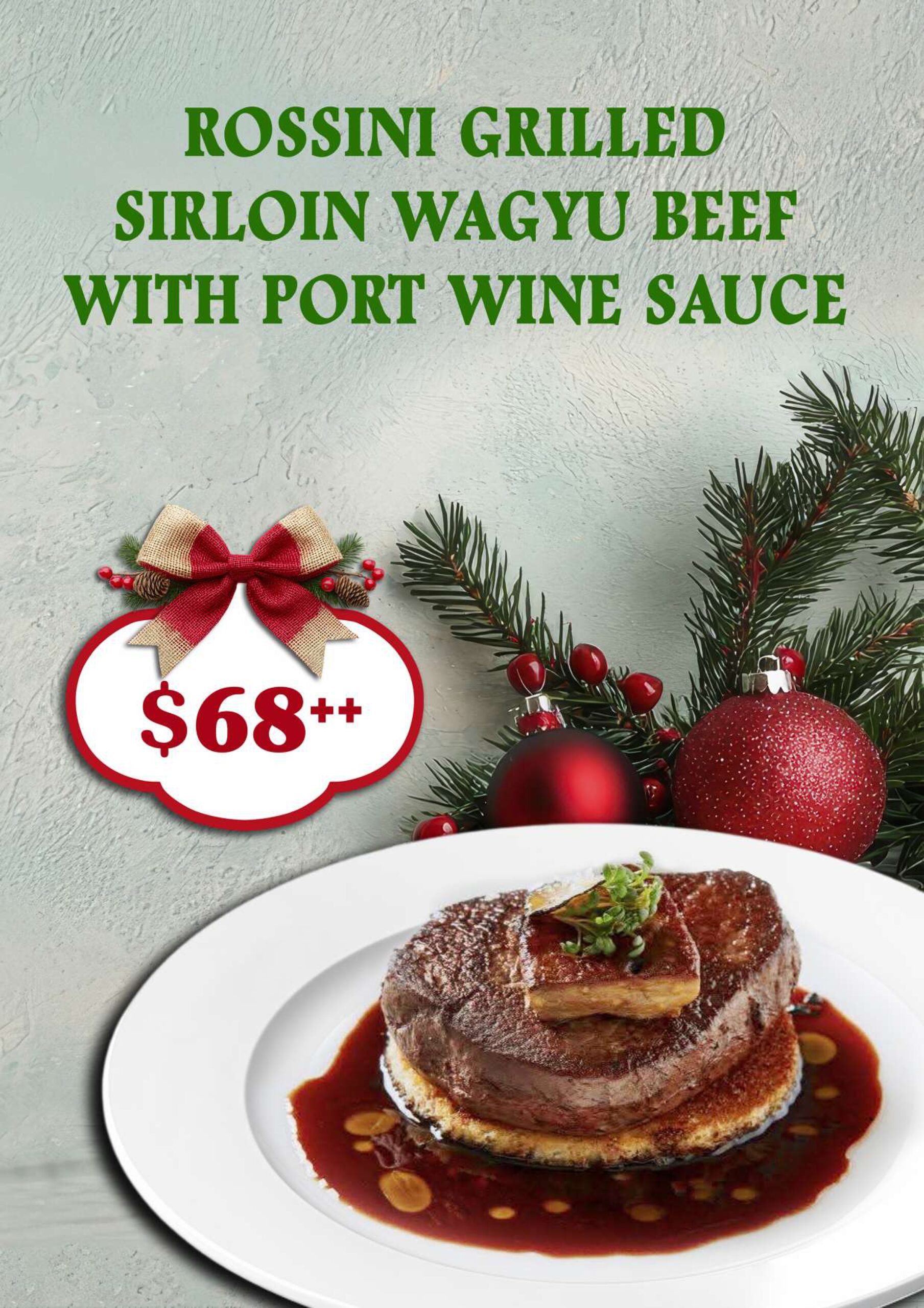 Elevate your holiday feasting with the exquisite Rossini Grilled Sirloin Wagyu Beef with Port Wine Sauce. This tender cut of Wagyu is a luxurious, unforgettable main course, perfectly drizzled with a rich Port Wine Sauce. Indulge for $68++.