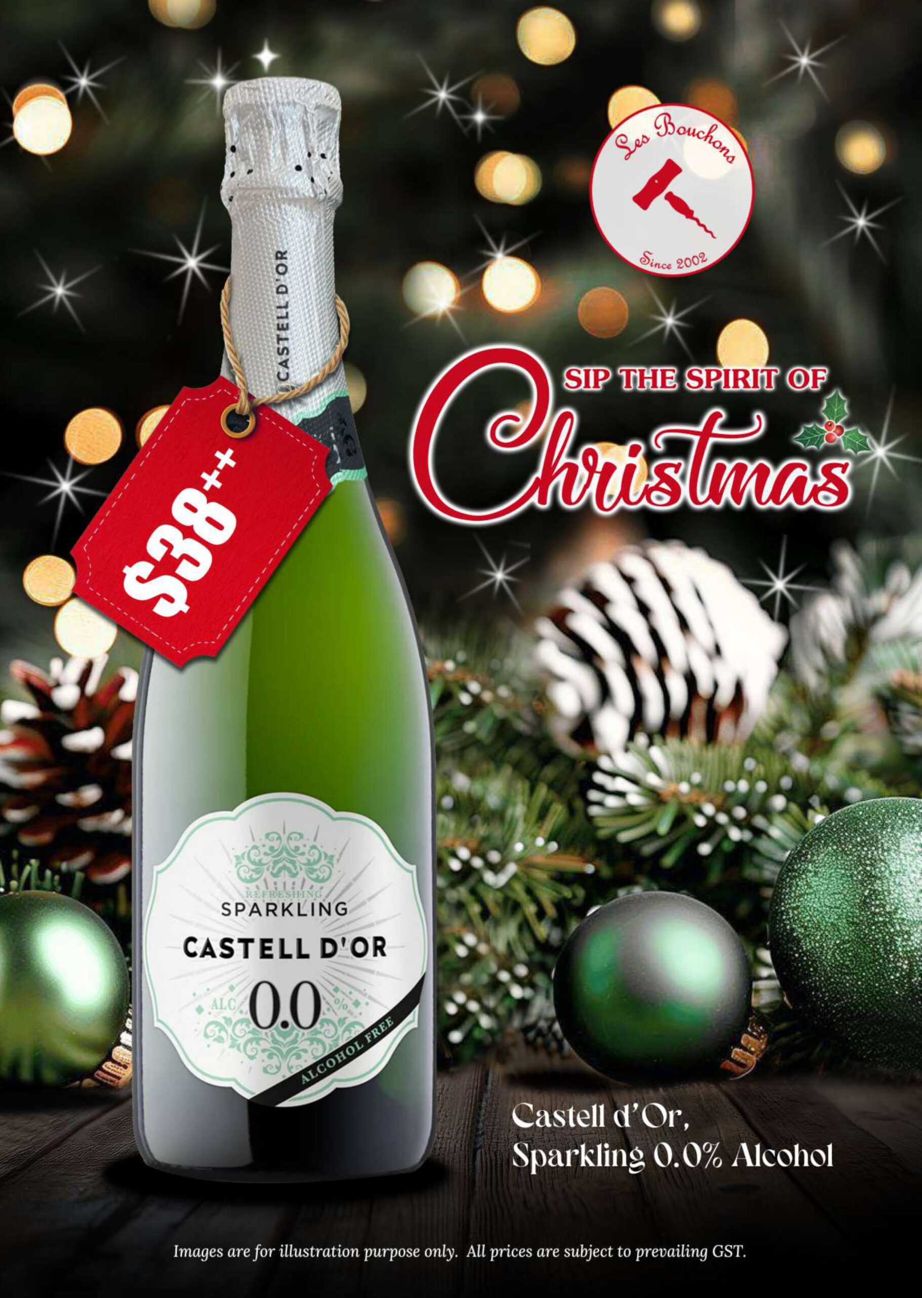 Toast the season guilt-free with the Castell d'Or Sparkling 0.0% Alcohol wine. Enjoy the spirit of Christmas with this festive, alcohol-free bubbly, available for a special price of $38++.